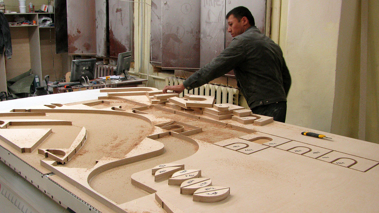 Производственные возможности Карата позволяют выпускать сложные современные изделия: например, тумбы для навигации в торговом центре. Здесь нашли применение и фрезерование, и формовка, и сращивание элементов.